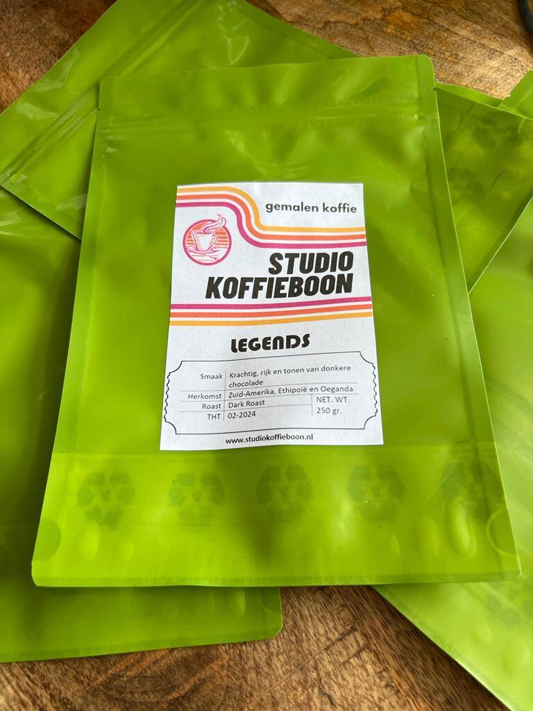 We hebben speciale zakjes voor koffie gekocht en de koffie malen we als er een bestelling binnenkomt, zodat het vers blijft. Ook de gemalen koffie leveren we in onze twee smaken Hero en Legends. In een zakje van 250 gram. Ook hiervan kan een proefpakket besteld worden. Etiketten hebben we zelf gemaakt.
